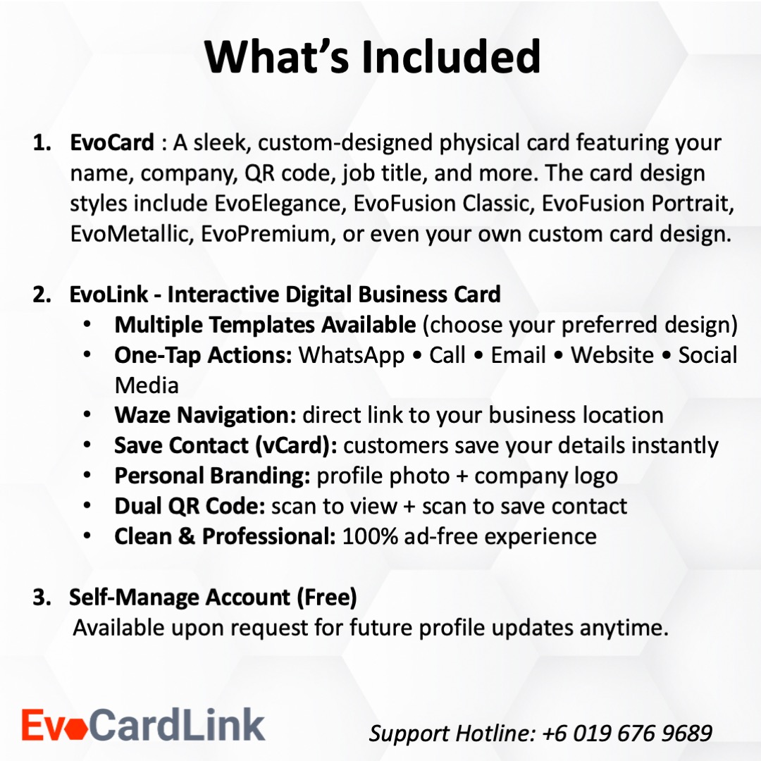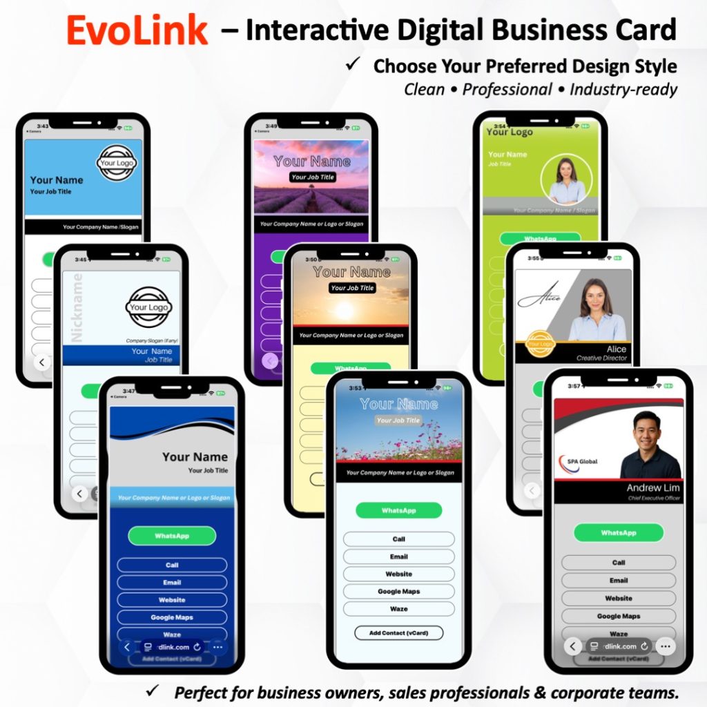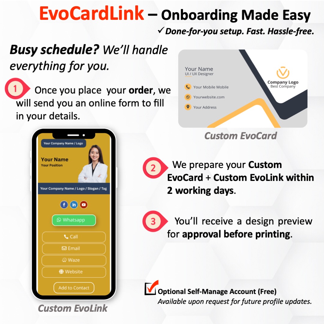 - Creation of EvoLink or Interactive Digital Business Card: We’ll create your Interactive Digital Business Card within 1-2 working days and notify you once it’s ready.