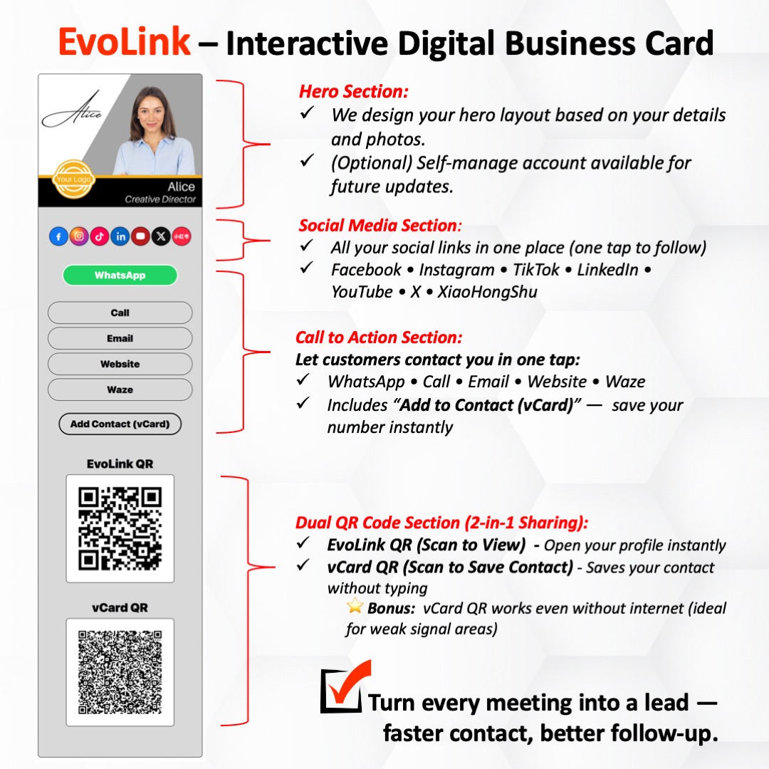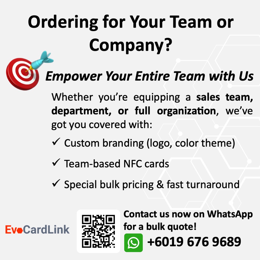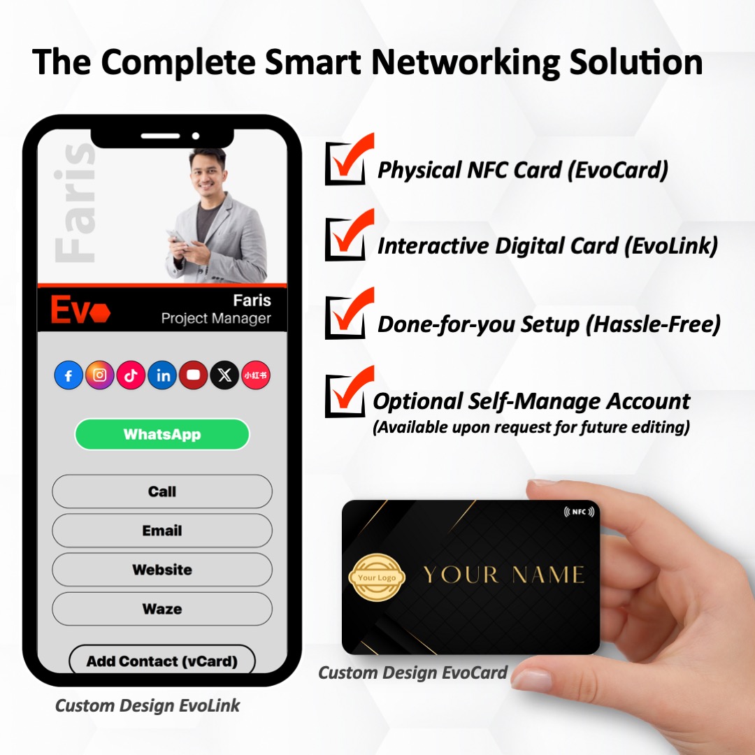 - Creation of EvoLink or Interactive Digital Business Card: We’ll create your Interactive Digital Business Card within 1-2 working days and notify you once it’s ready.