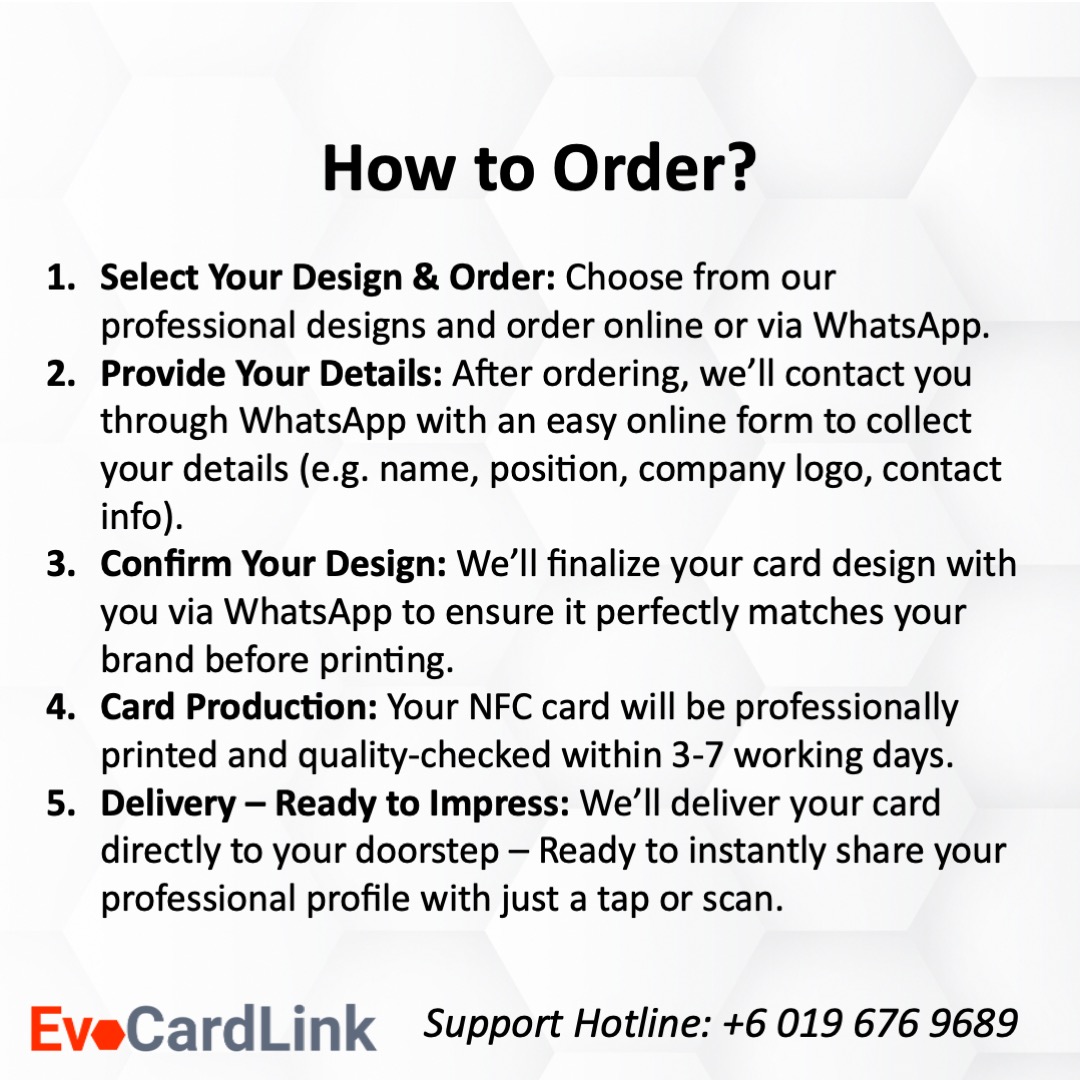 - Order Your Card: Choose the Own Card Design and leave a WhatsApp message with your order number at +6019 676 9689. If you would like to include the printing of a QR code, please request the QR code from us to incorporate it into your card design.